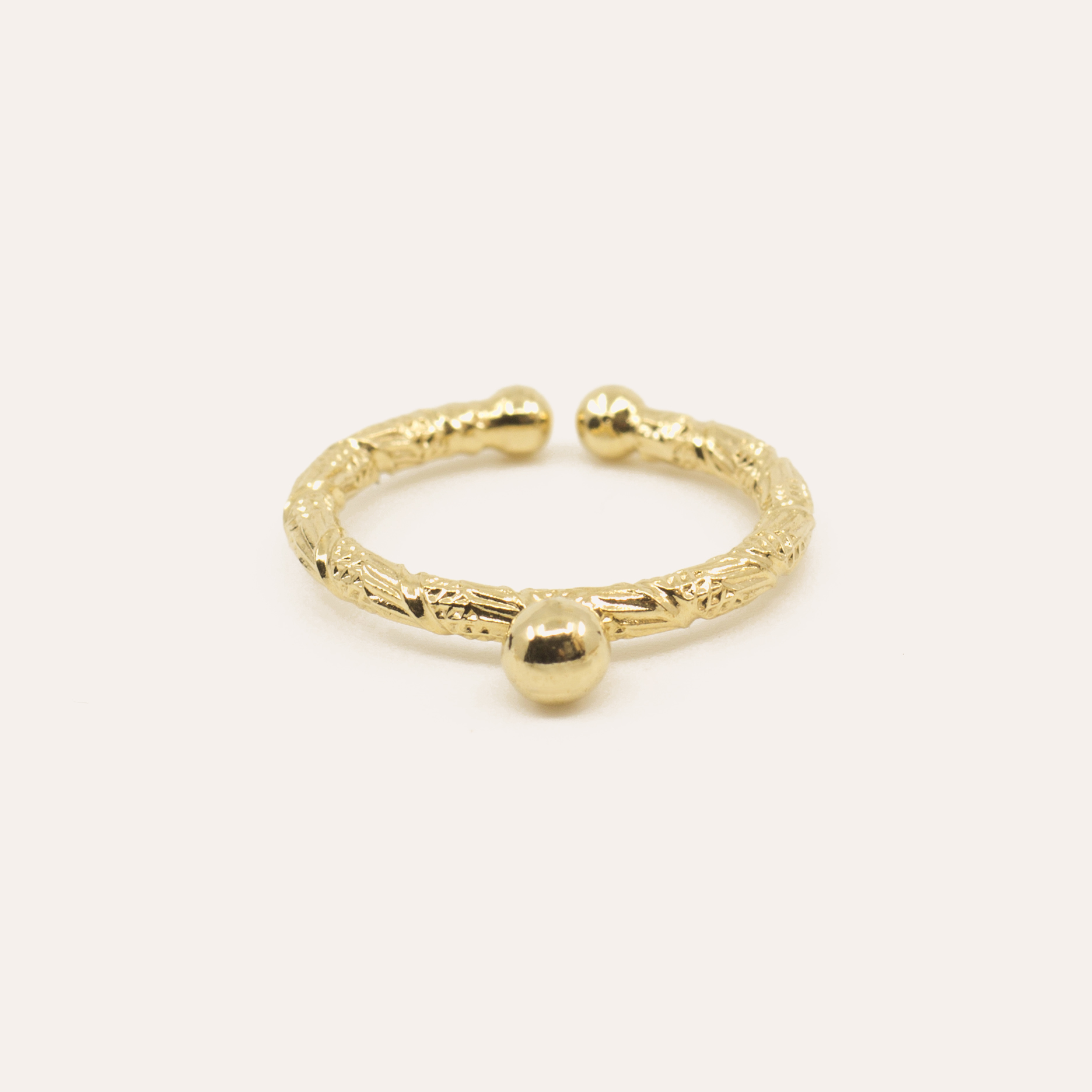 Originale tout en restant simple, la bague Pia séduit avec son corps de bague finement gravé réhaussé d’une petite bille dorée.