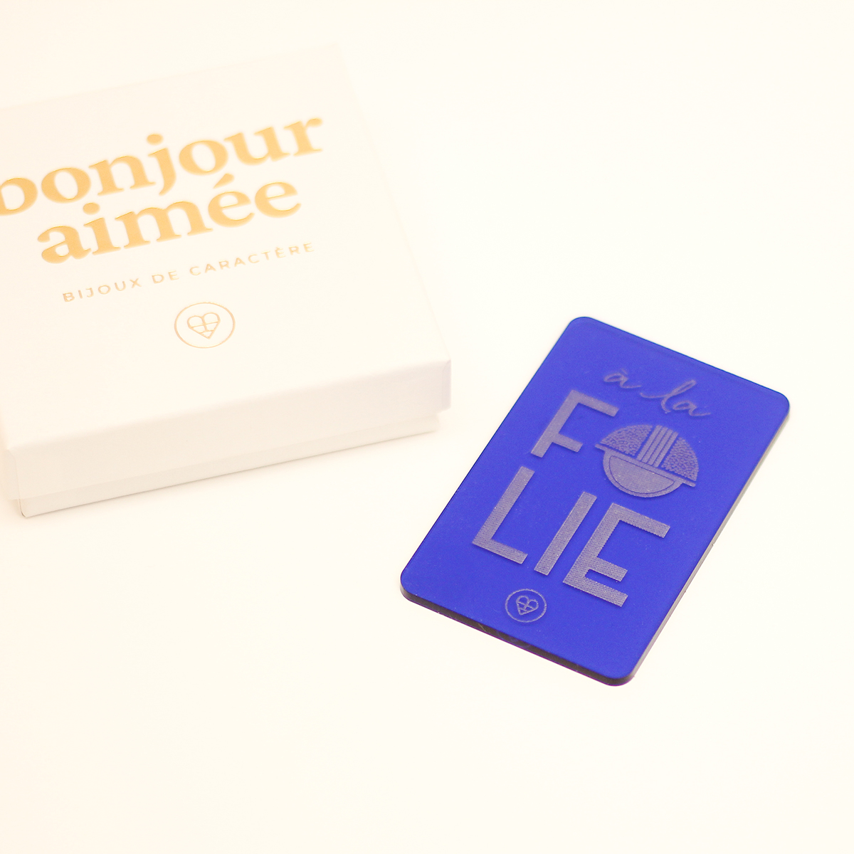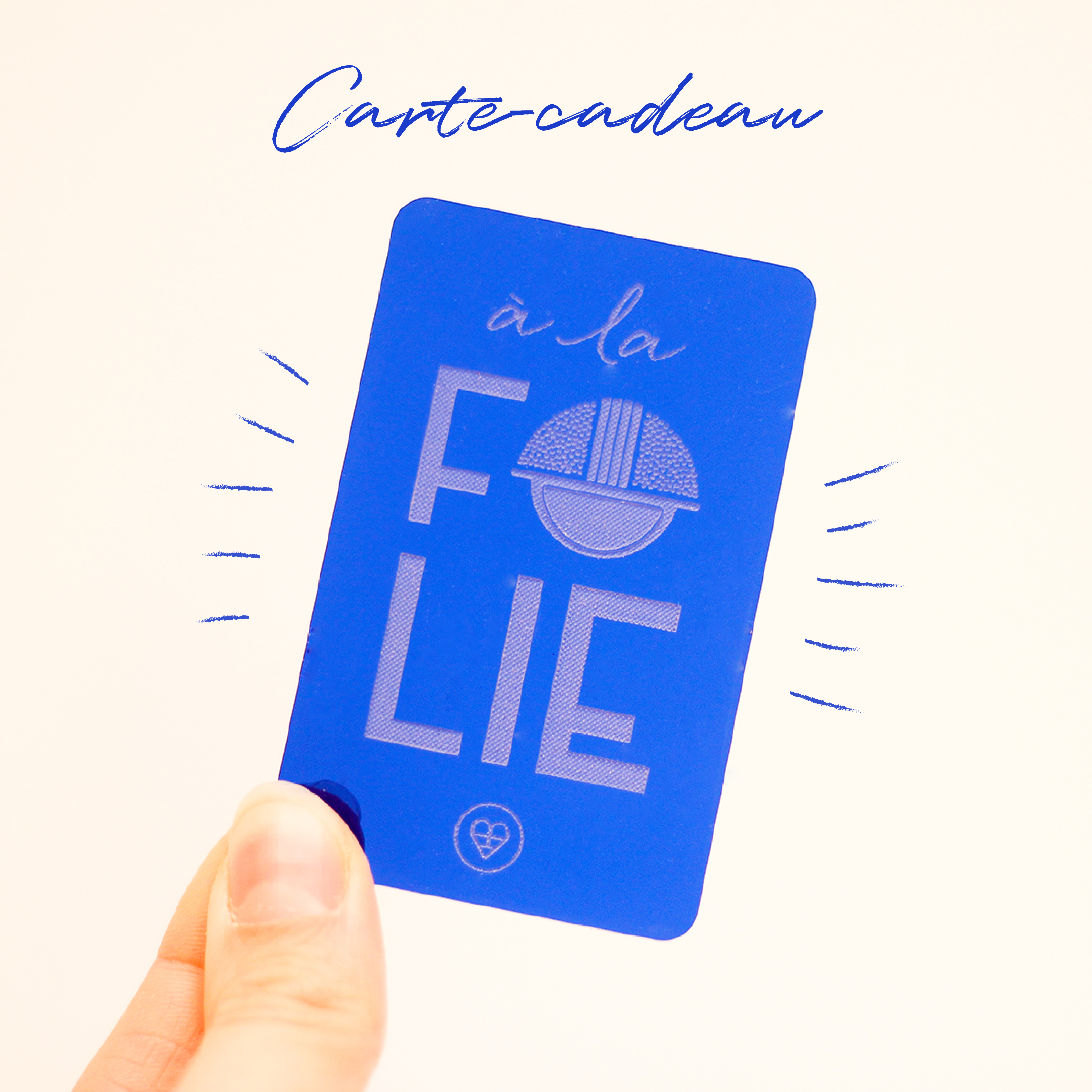 Nos cartes-cadeaux sont découpées et gravées dans du plexiglass bleu royal avec une jolie illustration design et rétro, à garder en souvenir. Le code à utiliser se situe au dos de la carte.